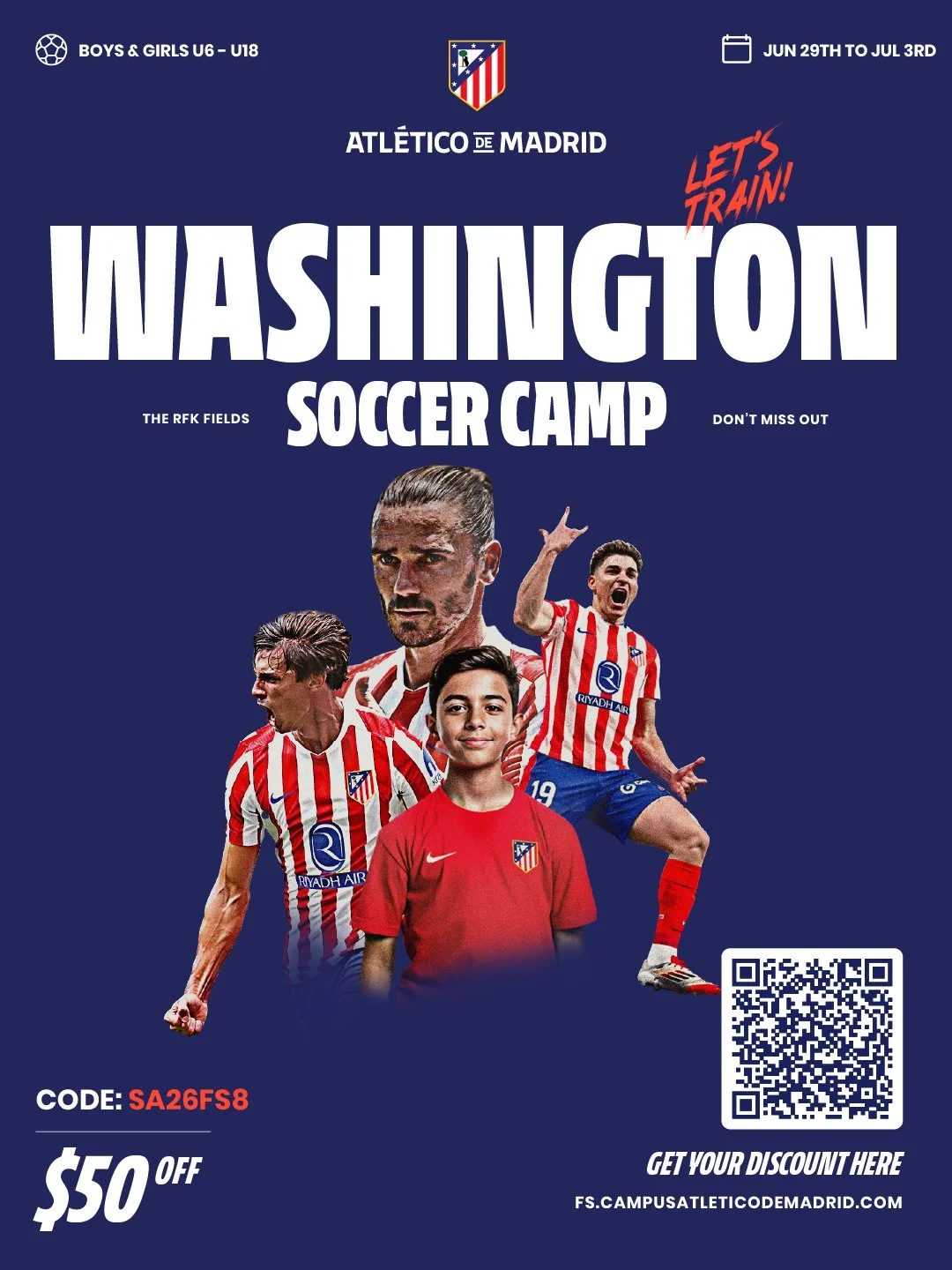 Atlético de Madrid Soccer Camps are excited to bring our international training methodology to the RFK Fields in Washington, DC. Designed for players and goalkeepers of all levels, the camp helps participants develop their technical, tactical, and physical abilities. Through professional coaching and a positive environment, players strengthen their skills, build confidence, and learn to turn challenges into opportunities.⚽🔴⚪