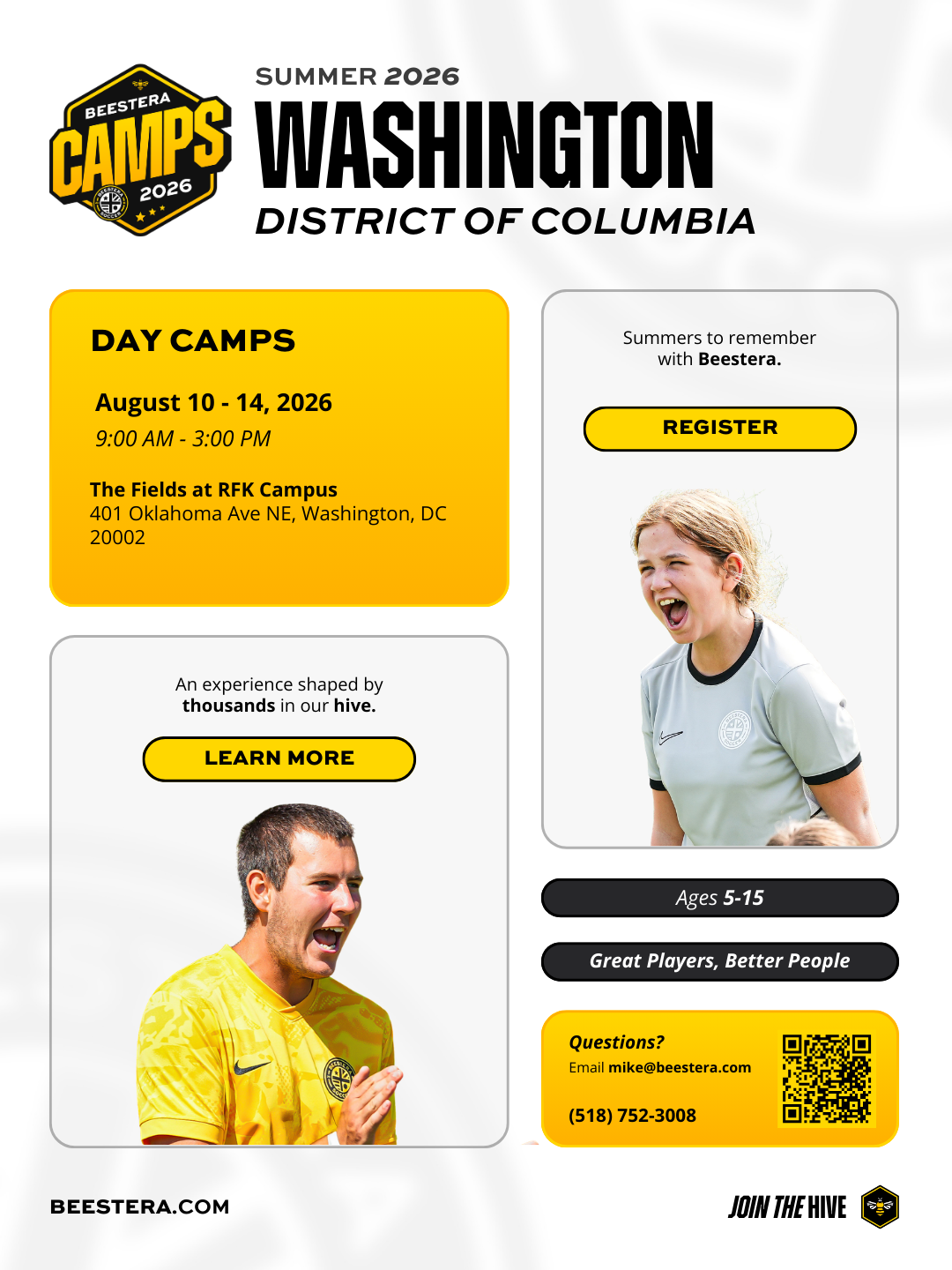 Beestera Soccer Camps provide a fun, high-energy training environment for players ages 5–15 of all skill levels. Led by experienced international and U.S. coaches, campers develop technical skills, creativity, and confidence through engaging drills, games, and competitions. Guided by our philosophy of “Great Players, Better People,” we focus on both player development and character growth.